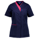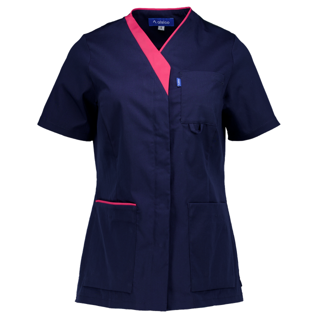 - V-neck with contrast piping for a clean, professional look