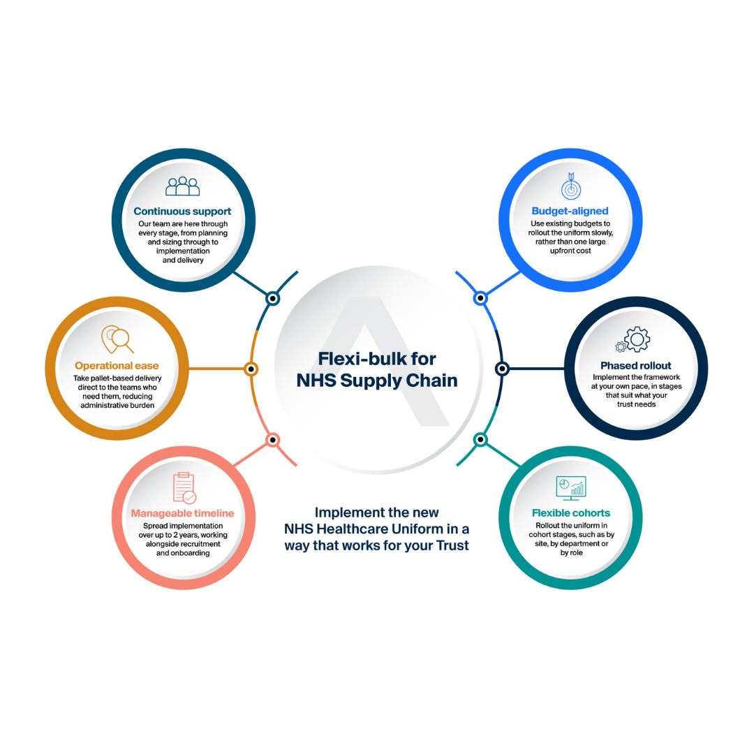 Flexi-bulk allows Trusts to phase the rollout of the NHS Healthcare Uniform by department, role, or site — reducing operational pressure. By spreading implementation over time and working within existing budgets, it makes large-scale uniform change more manageable.